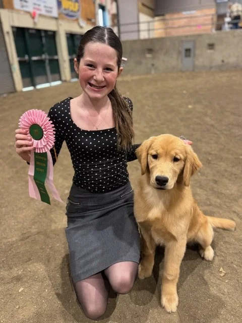 Reagan baby! Reagan is the epitome of cuteness! Reagan was born on May 8th, 2025, and is from the Arson X MerryBerry “Crime” litter. She joined our crew after Adelyn and I flew to Alaska for dog shows, and stayed afterwards for a few extra days to evaluate her litter! Reagan’s dam is a sibling to our “Libby” who was out of Blu X Lydia. The puppies were so lovely, we fell in love with her and couldn’t leave without her. Adelyn’s new little love. Her first weekend out competing in the 4-6 month beginner puppy competition she won Best in Show Beginner Puppy! Needless to say we are all very excited about this lovely little lady!
